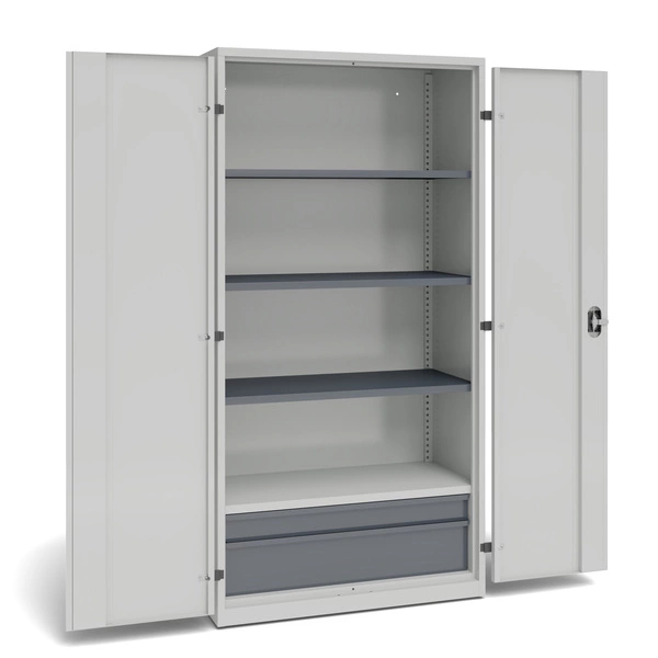 Szafa warsztatowa z 3 przestawnymi półkami, 1 półką stałą, szufladą o wys. 100 mm oraz szufladą o wys. 200 mm