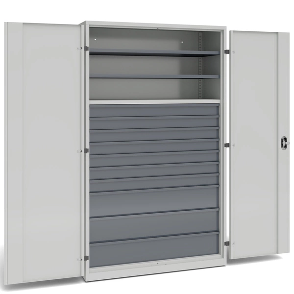 Szafa warsztatowa z 2 przestawnymi półkami, 1 półką stałą, 7 szufladami o wys. 100 mm, 3 szufladami o wys. 200 mm