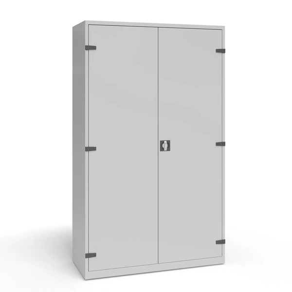 szafa warsztatowa o masywnej konstrukcji z pełnymi drzwiami, z profilem wzmacniającym, drzwi szafy osadzone są na mocnych zawiasach zewnętrznych, zamykane są zamkiem kluczowym z pokrętłem, z 3- punktowym systemem ryglowania, wewnątrz szafy umieszczone są listwy zaczepowe, na których zawieszone są: