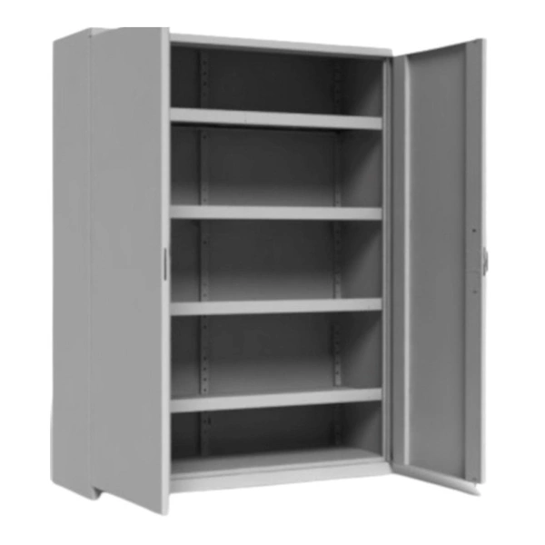 szafa w całości wykonana jest z blachy stalowej, drzwi skrzydłowe szafy posiadają od środka profile wzmacniające, drzwi osadzone są na wewnętrznych zawiasach, zapewniając swobodny dostęp do wnętrza mebla, drzwi zamykane są zamkiem kluczowym z pokrętłem, z 3- punktowym systemem ryglowania, szafa wyposażona jest w 4 półki z rantem, przestawne co 50 mm.