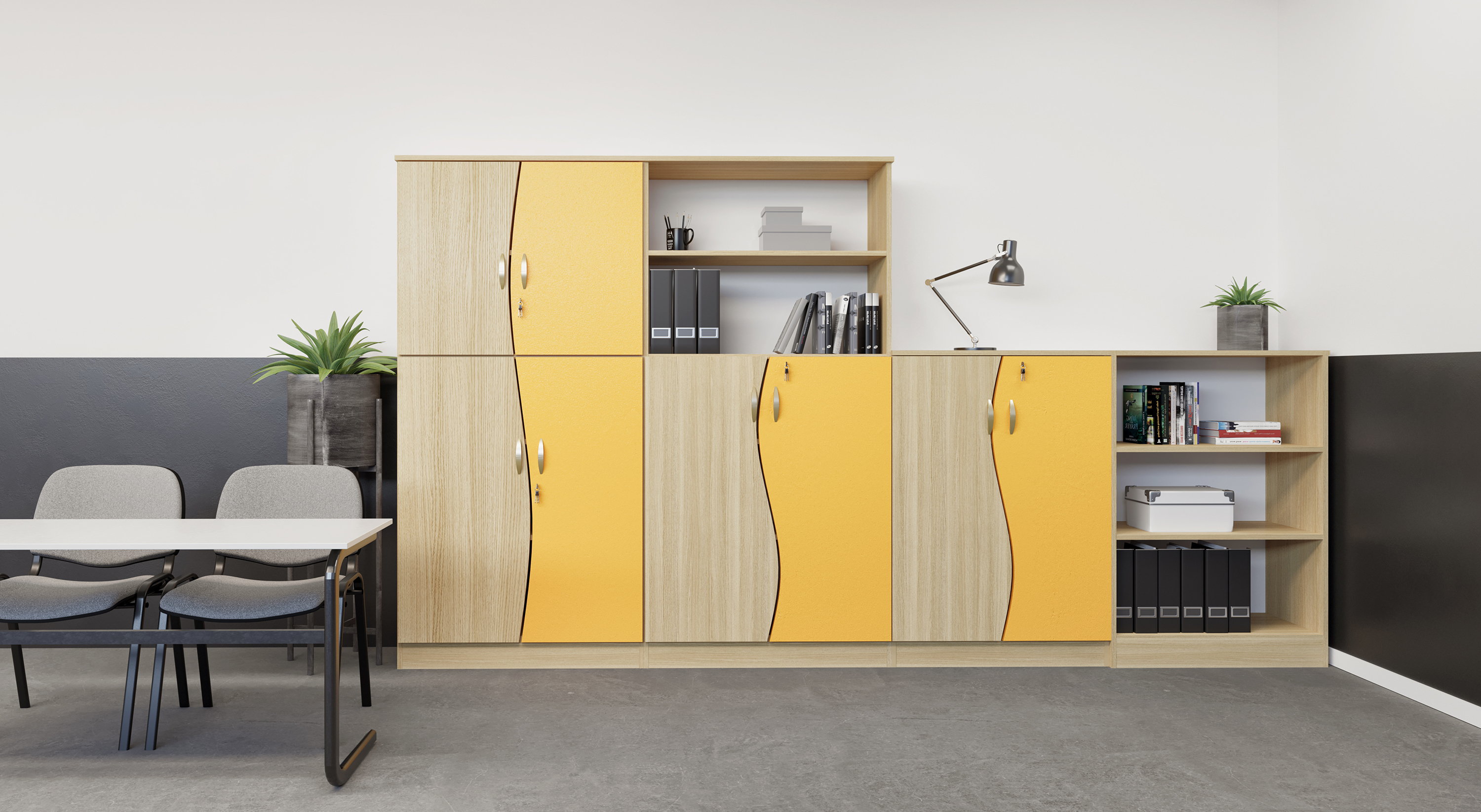 * Od lewej: Kujawiak FALA 2 Wymiar (WxSxG) 1850x900x400 mm. Wykonana z płyty laminowanej 18 mm. Posiada 5 przestrzeni na dokumenty, 2 w górnej szafce, 3 w dolnej. Drzwi zamykane na zamek z 2 kluczykami. Istnieje możliwość zamontowania zamków z system klucza MASTER. Metalowe uchwyty. Drzwi w kształcie fali.