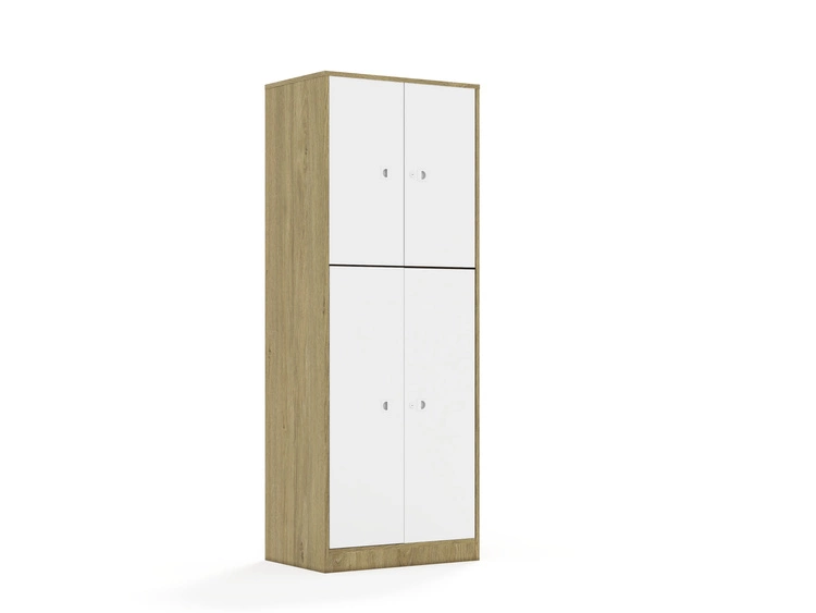 Mebel 2-kolumnowy posiadający 4 półki. Front wykonany z płyty melaminowanej o grubości 18 mm. Dostępne kolory: biały, szary, dąb kamienny. Zastosowane zawiasy Häfele Metalla 110 SM wpuszczane z hamulcem (cichy domyk) oraz prowadniki z systemem Clip Top, dzięki którym montaż i demontaż frontów odbywa się bez konieczności używania narzędzi. Plastikowy uchwyt w kolorze białym, osadzony w płycie meblowej. Jego płaska konstrukcja zapewnia większe bezpieczeństwo użytkowania. Mebel wyposażony w zamek, który zapewnia dodatkową ochronę i bezpieczeństwo przechowywanych przedmiotów.