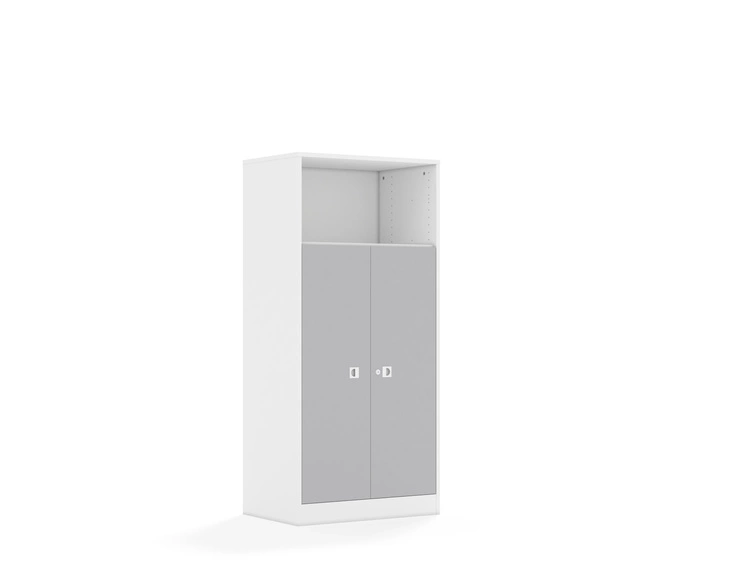 Korpus posiadający uniwersalne owiercenia umożliwiające zamontowanie półek na różnych wysokościach. Cokół w kolorze korpusu chroniący dolne krawędzie mebla przed uszkodzeniami i zabrudzeniami. Półki w kolorze korpusu wykonane z płyty melaminowanej o grubości 18 mm. Mocowanie półek za pomocą złącz RAFIX firmy Hafele. Montaż polegajacy na wsunięciu półki z góry w dół, podobnie jak przy tradycyjnych podpórkach. Wbudowany mechanizm mimośrodu dociągający półkę, zapewniający wysoką stabilność mebla. Stopki regulujące umożliwiające wypoziomowanie mebla. Stopki antypoślizgowe zabezpieczające podłogę przed zarysowaniem. Ściany tylne mebla wykonane z białej płyty HDF o grubości 3mm. Wpuszczane w nutę wykonaną w bokach oraz wieńcu górnym co nadaje stabilności meblom oraz sprawia, że wszelkie połączenia płyty hdf z meblem są niewidoczne. Dodatkowo HDF usztywniony jest punktowymi, również niewidocznymi plastikowymi stabilizatorami wkręconymi i wciśniętymi między płytę a nutę.