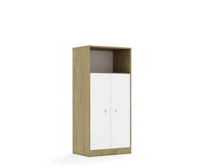 Mebel 1-kolumnowy posiadający 3 półki. Front wykonany z płyty melaminowanej o grubości 18 mm. Dostępne kolory: biały, szary, dąb kamienny. Zastosowane zawiasy Häfele Metalla 110 SM wpuszczane z hamulcem (cichy domyk) oraz prowadniki z systemem Clip Top, dzięki którym montaż i demontaż frontów odbywa się bez konieczności używania narzędzi. Plastikowy uchwyt w kolorze białym, osadzony w płycie meblowej. Jego płaska konstrukcja zapewnia większe bezpieczeństwo użytkowania. Mebel wyposażony w zamek, który zapewnia dodatkową ochronę i bezpieczeństwo przechowywanych przedmiotów.