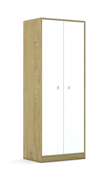 Mebel 1-kolumnowy posiadający 8 półek. Front wykonany z płyty melaminowanej o grubości 18 mm. Dostępne kolory: biały, szary, dąb kamienny. Zastosowane zawiasy Häfele Metalla 110 SM wpuszczane z hamulcem (cichy domyk) oraz prowadniki z systemem Clip Top, dzięki którym montaż i demontaż frontów odbywa się bez konieczności używania narzędzi. Plastikowy uchwyt w kolorze białym, osadzony w płycie meblowej. Jego płaska konstrukcja zapewnia większe bezpieczeństwo użytkowania. Mebel wyposażony w zamek, który zapewnia dodatkową ochronę i bezpieczeństwo przechowywanych przedmiotów.