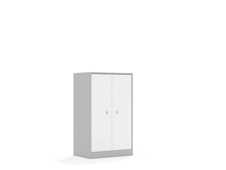 Korpus posiadający uniwersalne owiercenia umożliwiające zamontowanie półek na różnych wysokościach. Cokół w kolorze korpusu chroniący dolne krawędzie mebla przed uszkodzeniami i zabrudzeniami. Półki w kolorze korpusu wykonane z płyty melaminowanej o grubości 18 mm. Mocowanie półek za pomocą złącz RAFIX firmy Hafele. Montaż polegajacy na wsunięciu półki z góry w dół, podobnie jak przy tradycyjnych podpórkach. Wbudowany mechanizm mimośrodu dociągający półkę, zapewniający wysoką stabilność mebla. Stopki regulujące umożliwiające wypoziomowanie mebla. Stopki antypoślizgowe zabezpieczające podłogę przed zarysowaniem. Ściany tylne mebla wykonane z białej płyty HDF o grubości 3mm. Wpuszczane w nutę wykonaną w bokach oraz wieńcu górnym co nadaje stabilności meblom oraz sprawia, że wszelkie połączenia płyty hdf z meblem są niewidoczne. Dodatkowo HDF usztywniony jest punktowymi, również niewidocznymi plastikowymi stabilizatorami wkręconymi i wciśniętymi między płytę a nutę. Przegroda w kolorze korpusu wykonana z płyty melaminowanej o grubości 18 mm.