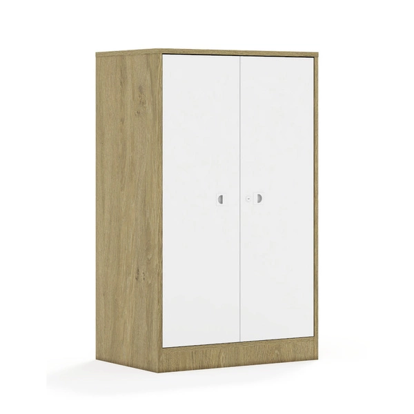 Mebel 2-kolumnowy posiadający 4 półki. Front wykonany z płyty melaminowanej o grubości 18 mm. Dostępne kolory: biały, szary, dąb kamienny. Zastosowane zawiasy Häfele Metalla 110 SM wpuszczane z hamulcem (cichy domyk) oraz prowadniki z systemem Clip Top, dzięki którym montaż i demontaż frontów odbywa się bez konieczności używania narzędzi. Plastikowy uchwyt w kolorze białym, osadzony w płycie meblowej. Jego płaska konstrukcja zapewnia większe bezpieczeństwo użytkowania. Mebel wyposażony w zamek, który zapewnia dodatkową ochronę i bezpieczeństwo przechowywanych przedmiotów.