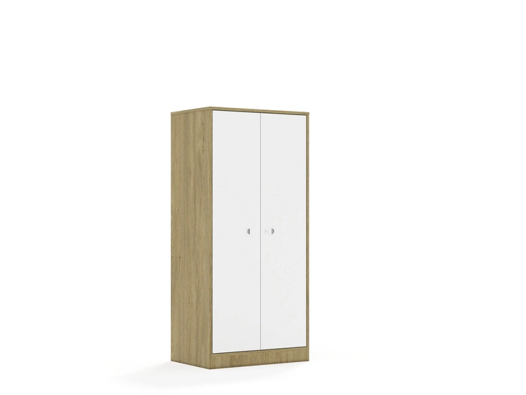 Mebel 2-kolumnowy posiadający 6 półek. Front wykonany z płyty melaminowanej o grubości 18 mm. Dostępne kolory: biały, szary, dąb kamienny. Zastosowane zawiasy Häfele Metalla 110 SM wpuszczane z hamulcem (cichy domyk) oraz prowadniki z systemem Clip Top, dzięki którym montaż i demontaż frontów odbywa się bez konieczności używania narzędzi. Plastikowy uchwyt w kolorze białym, osadzony w płycie meblowej. Jego płaska konstrukcja zapewnia większe bezpieczeństwo użytkowania. Mebel wyposażony w zamek, który zapewnia dodatkową ochronę i bezpieczeństwo przechowywanych przedmiotów.