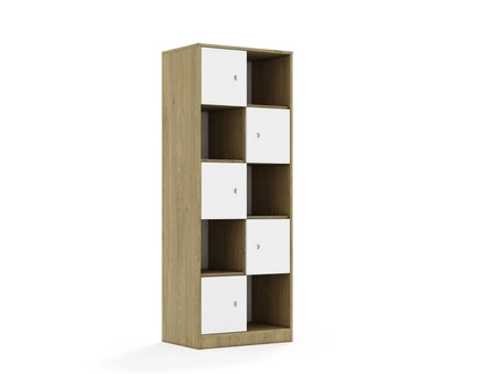 Mebel 2-kolumnowy posiadający 4 półki. Front wykonany z płyty melaminowanej o grubości 18 mm. Dostępne kolory: biały, szary, dąb kamienny. Zastosowane zawiasy Häfele Metalla 110 SM wpuszczane z hamulcem (cichy domyk) oraz prowadniki z systemem Clip Top, dzięki którym montaż i demontaż frontów odbywa się bez konieczności używania narzędzi. Plastikowy uchwyt w kolorze białym, osadzony w płycie meblowej. Jego płaska konstrukcja zapewnia większe bezpieczeństwo użytkowania.