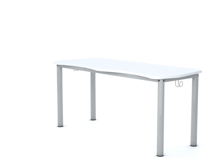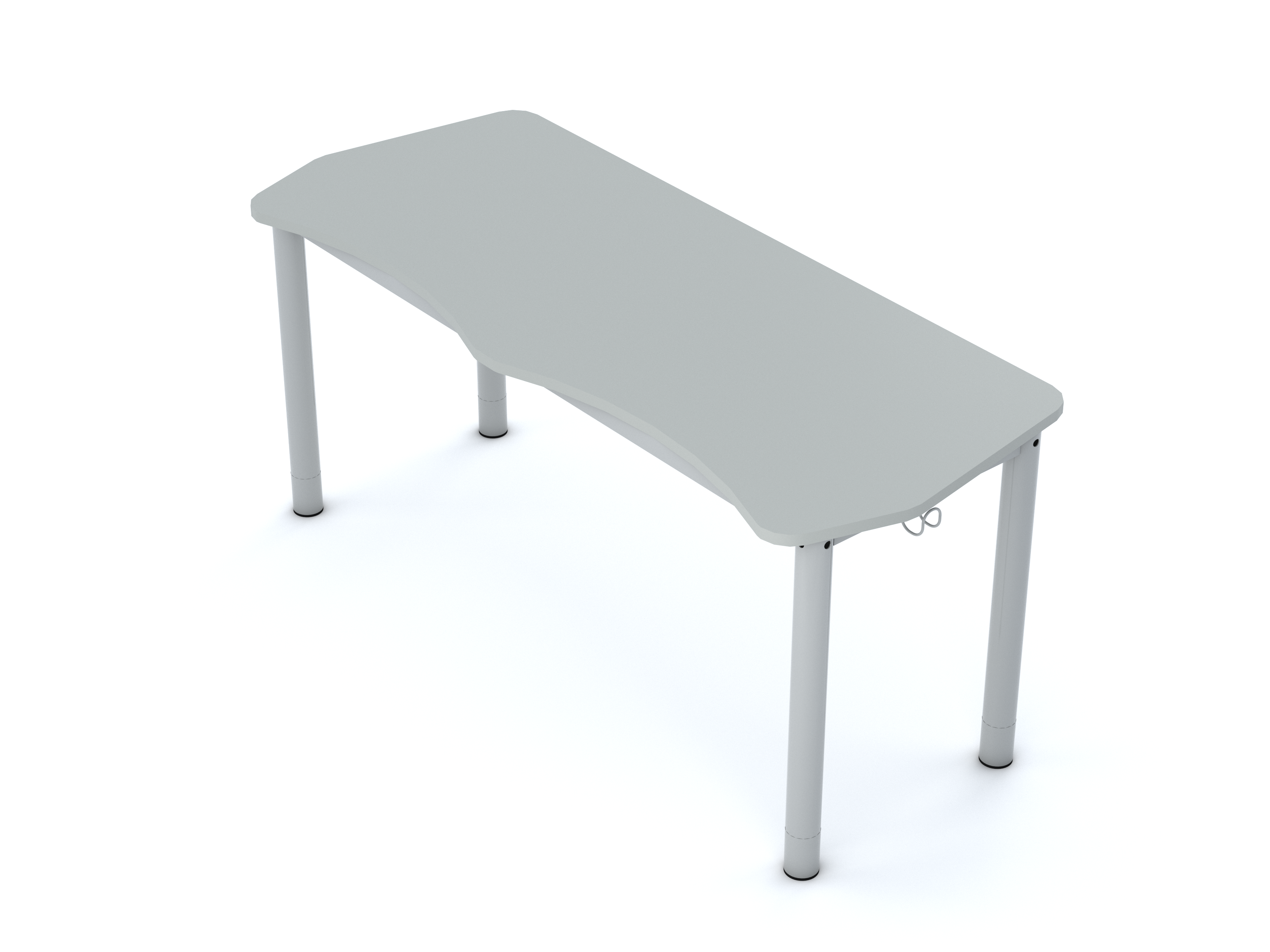 Stolik szkolny w kształcie fali, zapewniający uczniom odpowiednie miejsce do nauki, pisania i wykonywania innych czynności edukacyjnych. Wymiar blatu 1350x550 mm. Blat wykonany z płyty melaminowanej o grubości 18 mm, posiadającej klasę higieniczności e1. Obrzeże blatu wykończone listwą PCV 2 mm. Blat połączony ze stelażem za pomocą metalowych śrub. Dostępny w 3 kolorach do wyboru (biały, szary, dąb kamienny). Stelaż metalowy, wykonany ze stalowego profilu 50x1,5 mm gwarantujący stabilność i trwałość konstrukcji. Dostępny w kolorze szarym (RAL 9006) lub białym (9003). Zastosowanie haczyków po obu stronach ramy może służyć do zawieszania plecaków lub toreb. Stopki z tworzywa sztucznego w kolorze czarnym. Stolik dostępny w wersji regulowanej (rozmiary 2-4, rozmiary 4-6). Modułowa regulacja wysokości stelaża. Stolik posiada certyfikat zgodności z normą PN-EN 1729-1:2016-02 oraz PN-EN 1729-2+2016-02 wydany przez jednostkę certyfikującą posiadającą akredytację Polskiego Centrum Akredytacji.
