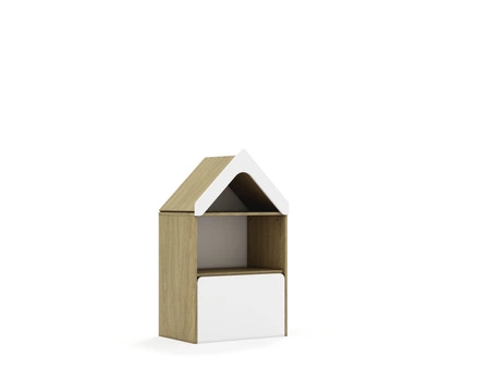 Mebel 1-kolumnowy posiadający 1 półkę i daszek. Skrzynia wsuwana w mebel wykonana z płyty melaminowanej o grubości 18 mm, wyposażona w kółka, które nie rysują podłogi. Front wykonany z płyty melaminowanej o grubości 18 mm w kolorze białym. Konstrukcja skrzyni umożliwia łatwe wysuwanie, co zapewnia wygodny dostęp do przechowywanych przedmiotów. Dzięki solidnym materiałom i mobilności, skrzynia stanowi praktyczne rozwiązanie do zwiększenia funkcjonalności mebla, oferując dodatkową przestrzeń do przechowywania oraz ochronę podłogi przed uszkodzeniami. Daszek stanowi atrakcyjny dodatek do linii mebli BLOX. Korona daszka wykonana z solidnej płyty MDF o grubości 16 mm, malowana i lakierowana farbą posiadającą atest Polskiego Towarzystwa Alergologicznego (PTA). Przód i boki daszku w kolorze białym, tył w kolorze korpusu. Cała powierzchnia daszka posiada zaokrąglone krawędzie, uzyskane dzięki precyzyjnemu wycinaniu na ploterze frezującym, co zwiększa bezpieczeństwo użytkowania. Element przymocowany do korpusu mebla za pomocą elementów pośredniczących.