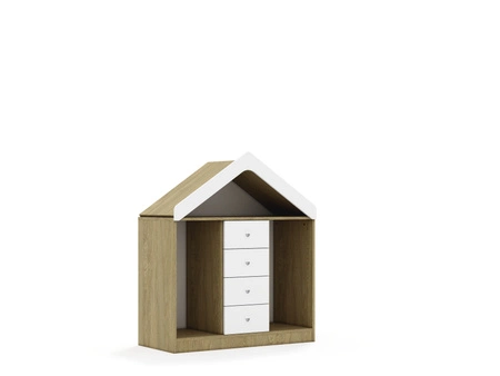 Mebel 3-kolumnowy bez półek z daszkiem. Szuflada wykonana z płyty melaninowanej o grubości 18 mm o klasie higeniczności E1. Dostępne kolory: biały, szary, dąb kamienny. Metalowe prowadnice z wysokogatunkowej stali, wyposażone w funkcję samodociągu, zapewniają trwałość, wytrzymałość oraz płynne i ciche zamykanie. Mechanizm automatycznie domyka szufladę po lekkim popchnięciu, gwarantując wygodę i bezszelestne użytkowanie. Plastikowy uchwyt w kolorze białym, osadzony w płycie meblowej. Jego płaska konstrukcja zapewnia większe bezpieczeństwo użytkowania. Daszek stanowi atrakcyjny dodatek do linii mebli BLOX. Korona daszka wykonana z solidnej płyty MDF o grubości 16 mm, malowana i lakierowana farbą posiadającą atest Polskiego Towarzystwa Alergologicznego (PTA). Przód i boki daszku w kolorze białym, tył w kolorze korpusu. Cała powierzchnia daszka posiada zaokrąglone krawędzie, uzyskane dzięki precyzyjnemu wycinaniu na ploterze frezującym, co zwiększa bezpieczeństwo użytkowania. Element przymocowany do korpusu mebla za pomocą elementów pośredniczących.