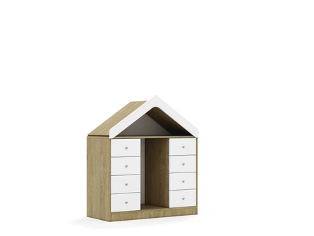 Mebel 3-kolumnowy bez półek z daszkiem. Szuflada wykonana z płyty melaninowanej o grubości 18 mm o klasie higeniczności E1. Dostępne kolory: biały, szary, dąb kamienny. Metalowe prowadnice z wysokogatunkowej stali, wyposażone w funkcję samodociągu, zapewniają trwałość, wytrzymałość oraz płynne i ciche zamykanie. Mechanizm automatycznie domyka szufladę po lekkim popchnięciu, gwarantując wygodę i bezszelestne użytkowanie. Plastikowy uchwyt w kolorze białym, osadzony w płycie meblowej. Jego płaska konstrukcja zapewnia większe bezpieczeństwo użytkowania. Daszek stanowi atrakcyjny dodatek do linii mebli BLOX. Korona daszka wykonana z solidnej płyty MDF o grubości 16 mm, malowana i lakierowana farbą posiadającą atest Polskiego Towarzystwa Alergologicznego (PTA). Przód i boki daszku w kolorze białym, tył w kolorze korpusu. Cała powierzchnia daszka posiada zaokrąglone krawędzie, uzyskane dzięki precyzyjnemu wycinaniu na ploterze frezującym, co zwiększa bezpieczeństwo użytkowania. Element przymocowany do korpusu mebla za pomocą elementów pośredniczących.