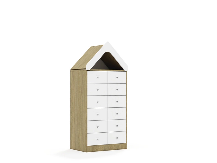 Mebel 2-kolumnowy posiadający 4 półki i daszek. Szuflada wykonana z płyty melaninowanej o grubości 18 mm o klasie higeniczności E1. Dostępne kolory: biały, szary, dąb kamienny. Metalowe prowadnice z wysokogatunkowej stali, wyposażone w funkcję samodociągu, zapewniają trwałość, wytrzymałość oraz płynne i ciche zamykanie. Mechanizm automatycznie domyka szufladę po lekkim popchnięciu, gwarantując wygodę i bezszelestne użytkowanie. Plastikowy uchwyt w kolorze białym, osadzony w płycie meblowej. Jego płaska konstrukcja zapewnia większe bezpieczeństwo użytkowania. Daszek stanowi atrakcyjny dodatek do linii mebli BLOX. Korona daszka wykonana z solidnej płyty MDF o grubości 16 mm, malowana i lakierowana farbą posiadającą atest Polskiego Towarzystwa Alergologicznego (PTA). Przód i boki daszku w kolorze białym, tył w kolorze korpusu. Cała powierzchnia daszka posiada zaokrąglone krawędzie, uzyskane dzięki precyzyjnemu wycinaniu na ploterze frezującym, co zwiększa bezpieczeństwo użytkowania. Element przymocowany do korpusu mebla za pomocą elementów pośredniczących.