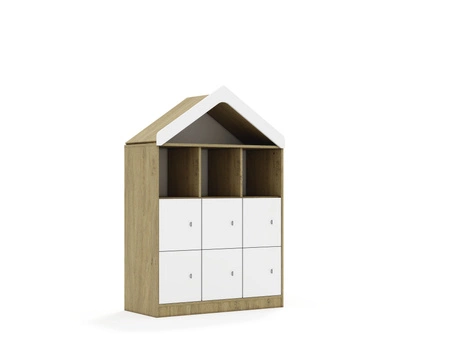 Mebel 3-kolumnowy posiadający 6 półek i daszek. Front wykonany z płyty melaminowanej o grubości 18 mm. Dostępne kolory: biały, szary, dąb kamienny. Zastosowane zawiasy Häfele Metalla 110 SM wpuszczane z hamulcem (cichy domyk) oraz prowadniki z systemem Clip Top, dzięki którym montaż i demontaż frontów odbywa się bez konieczności używania narzędzi. Plastikowy uchwyt w kolorze białym, osadzony w płycie meblowej. Jego płaska konstrukcja zapewnia większe bezpieczeństwo użytkowania. Daszek stanowi atrakcyjny dodatek do linii mebli BLOX. Korona daszka wykonana z solidnej płyty MDF o grubości 16 mm, malowana i lakierowana farbą posiadającą atest Polskiego Towarzystwa Alergologicznego (PTA). Przód i boki daszku w kolorze białym, tył w kolorze korpusu. Cała powierzchnia daszka posiada zaokrąglone krawędzie, uzyskane dzięki precyzyjnemu wycinaniu na ploterze frezującym, co zwiększa bezpieczeństwo użytkowania. Element przymocowany do korpusu mebla za pomocą elementów pośredniczących.