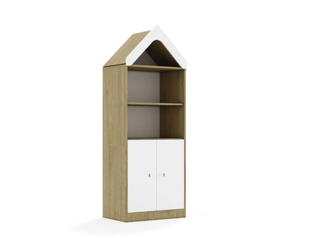 Mebel 1-kolumnowy posiadający 3 półki i daszek. Front wykonany z płyty melaminowanej o grubości 18 mm. Dostępne kolory: biały, szary, dąb kamienny. Zastosowane zawiasy Häfele Metalla 110 SM wpuszczane z hamulcem (cichy domyk) oraz prowadniki z systemem Clip Top, dzięki którym montaż i demontaż frontów odbywa się bez konieczności używania narzędzi. Plastikowy uchwyt w kolorze białym, osadzony w płycie meblowej. Jego płaska konstrukcja zapewnia większe bezpieczeństwo użytkowania. Mebel wyposażony w zamek, który zapewnia dodatkową ochronę i bezpieczeństwo przechowywanych przedmiotów. Daszek stanowi atrakcyjny dodatek do linii mebli BLOX. Korona daszka wykonana z solidnej płyty MDF o grubości 16 mm, malowana i lakierowana farbą posiadającą atest Polskiego Towarzystwa Alergologicznego (PTA). Przód i boki daszku w kolorze białym, tył w kolorze korpusu. Cała powierzchnia daszka posiada zaokrąglone krawędzie, uzyskane dzięki precyzyjnemu wycinaniu na ploterze frezującym, co zwiększa bezpieczeństwo użytkowania. Element przymocowany do korpusu mebla za pomocą elementów pośredniczących.