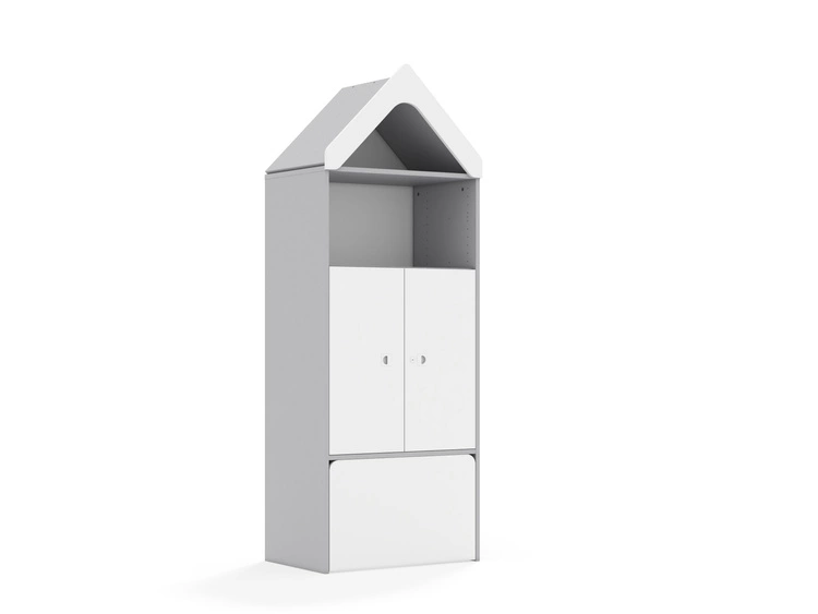 Korpus posiadający uniwersalne owiercenia umożliwiające zamontowanie półek na różnych wysokościach. Cokół w kolorze korpusu chroniący dolne krawędzie mebla przed uszkodzeniami i zabrudzeniami. Półki w kolorze korpusu wykonane z płyty melaminowanej o grubości 18 mm. Mocowanie półek za pomocą złącz RAFIX firmy Hafele. Montaż polegajacy na wsunięciu półki z góry w dół, podobnie jak przy tradycyjnych podpórkach. Wbudowany mechanizm mimośrodu dociągający półkę, zapewniający wysoką stabilność mebla. Stopki regulujące umożliwiające wypoziomowanie mebla. Stopki antypoślizgowe zabezpieczające podłogę przed zarysowaniem. Ściany tylne mebla wykonane z białej płyty HDF o grubości 3mm. Wpuszczane w nutę wykonaną w bokach oraz wieńcu górnym co nadaje stabilności meblom oraz sprawia, że wszelkie połączenia płyty hdf z meblem są niewidoczne. Dodatkowo HDF usztywniony jest punktowymi, również niewidocznymi plastikowymi stabilizatorami wkręconymi i wciśniętymi między płytę a nutę.