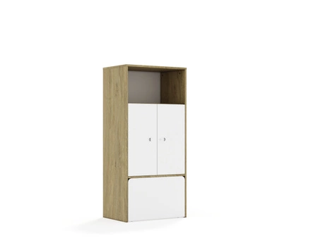 Mebel 1-kolumnowy posiadający 3 półki. Front wykonany z płyty melaminowanej o grubości 18 mm. Dostępne kolory: biały, szary, dąb kamienny. Zastosowane zawiasy Häfele Metalla 110 SM wpuszczane z hamulcem (cichy domyk) oraz prowadniki z systemem Clip Top, dzięki którym montaż i demontaż frontów odbywa się bez konieczności używania narzędzi. Plastikowy uchwyt w kolorze białym, osadzony w płycie meblowej. Jego płaska konstrukcja zapewnia większe bezpieczeństwo użytkowania. Mebel wyposażony w zamek, który zapewnia dodatkową ochronę i bezpieczeństwo przechowywanych przedmiotów. Skrzynia wsuwana w mebel wykonana z płyty melaminowanej o grubości 18 mm, wyposażona w kółka, które nie rysują podłogi. Front wykonany z płyty melaminowanej o grubości 18 mm w kolorze białym. Konstrukcja skrzyni umożliwia łatwe wysuwanie, co zapewnia wygodny dostęp do przechowywanych przedmiotów. Dzięki solidnym materiałom i mobilności, skrzynia stanowi praktyczne rozwiązanie do zwiększenia funkcjonalności mebla, oferując dodatkową przestrzeń do przechowywania oraz ochronę podłogi przed uszkodzeniami.