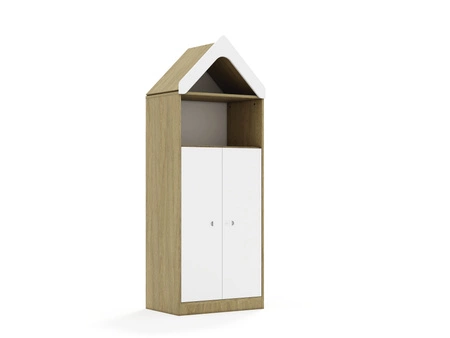 Mebel 1-kolumnowy posiadający 3 półki i daszek. Front wykonany z płyty melaminowanej o grubości 18 mm. Dostępne kolory: biały, szary, dąb kamienny. Zastosowane zawiasy Häfele Metalla 110 SM wpuszczane z hamulcem (cichy domyk) oraz prowadniki z systemem Clip Top, dzięki którym montaż i demontaż frontów odbywa się bez konieczności używania narzędzi. Plastikowy uchwyt w kolorze białym, osadzony w płycie meblowej. Jego płaska konstrukcja zapewnia większe bezpieczeństwo użytkowania. Mebel wyposażony w zamek, który zapewnia dodatkową ochronę i bezpieczeństwo przechowywanych przedmiotów. Daszek stanowi atrakcyjny dodatek do linii mebli BLOX. Korona daszka wykonana z solidnej płyty MDF o grubości 16 mm, malowana i lakierowana farbą posiadającą atest Polskiego Towarzystwa Alergologicznego (PTA). Przód i boki daszku w kolorze białym, tył w kolorze korpusu. Cała powierzchnia daszka posiada zaokrąglone krawędzie, uzyskane dzięki precyzyjnemu wycinaniu na ploterze frezującym, co zwiększa bezpieczeństwo użytkowania. Element przymocowany do korpusu mebla za pomocą elementów pośredniczących.