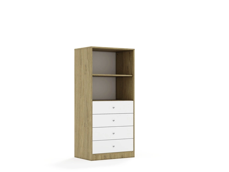Mebel 1-kolumnowy posiadający 3 półki. Szuflada wykonana z płyty melaninowanej o grubości 18 mm o klasie higeniczności E1. Dostępne kolory: biały, szary, dąb kamienny. Metalowe prowadnice z wysokogatunkowej stali, wyposażone w funkcję samodociągu, zapewniają trwałość, wytrzymałość oraz płynne i ciche zamykanie. Mechanizm automatycznie domyka szufladę po lekkim popchnięciu, gwarantując wygodę i bezszelestne użytkowanie. Plastikowy uchwyt w kolorze białym, osadzony w płycie meblowej. Jego płaska konstrukcja zapewnia większe bezpieczeństwo użytkowania.