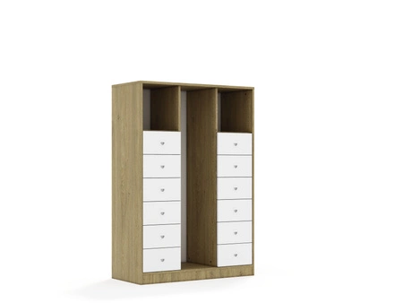 Mebel 3-kolumnowy bez półek. Szuflada wykonana z płyty melaninowanej o grubości 18 mm o klasie higeniczności E1. Dostępne kolory: biały, szary, dąb kamienny. Metalowe prowadnice z wysokogatunkowej stali, wyposażone w funkcję samodociągu, zapewniają trwałość, wytrzymałość oraz płynne i ciche zamykanie. Mechanizm automatycznie domyka szufladę po lekkim popchnięciu, gwarantując wygodę i bezszelestne użytkowanie. Plastikowy uchwyt w kolorze białym, osadzony w płycie meblowej. Jego płaska konstrukcja zapewnia większe bezpieczeństwo użytkowania.