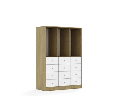 Mebel 3-kolumnowy bez półek. Szuflada wykonana z płyty melaninowanej o grubości 18 mm o klasie higeniczności E1. Dostępne kolory: biały, szary, dąb kamienny. Metalowe prowadnice z wysokogatunkowej stali, wyposażone w funkcję samodociągu, zapewniają trwałość, wytrzymałość oraz płynne i ciche zamykanie. Mechanizm automatycznie domyka szufladę po lekkim popchnięciu, gwarantując wygodę i bezszelestne użytkowanie. Plastikowy uchwyt w kolorze białym, osadzony w płycie meblowej. Jego płaska konstrukcja zapewnia większe bezpieczeństwo użytkowania.