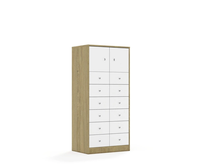Mebel 2-kolumnowy posiadający 6 półek. Front wykonany z płyty melaminowanej o grubości 18 mm. Dostępne kolory: biały, szary, dąb kamienny. Zastosowane zawiasy Häfele Metalla 110 SM wpuszczane z hamulcem (cichy domyk) oraz prowadniki z systemem Clip Top, dzięki którym montaż i demontaż frontów odbywa się bez konieczności używania narzędzi. Plastikowy uchwyt w kolorze białym, osadzony w płycie meblowej. Jego płaska konstrukcja zapewnia większe bezpieczeństwo użytkowania. Szuflada wykonana z płyty melaninowanej o grubości 18 mm o klasie higeniczności E1. Dostępne kolory: biały, szary, dąb kamienny. Metalowe prowadnice z wysokogatunkowej stali, wyposażone w funkcję samodociągu, zapewniają trwałość, wytrzymałość oraz płynne i ciche zamykanie. Mechanizm automatycznie domyka szufladę po lekkim popchnięciu, gwarantując wygodę i bezszelestne użytkowanie. Plastikowy uchwyt w kolorze białym, osadzony w płycie meblowej. Jego płaska konstrukcja zapewnia większe bezpieczeństwo użytkowania.