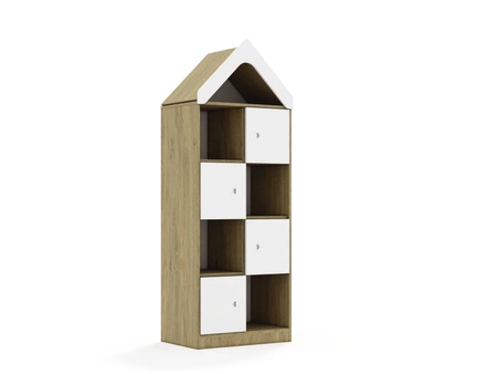 Mebel 2-kolumnowy posiadający 6 półek i daszek. Front wykonany z płyty melaminowanej o grubości 18 mm. Dostępne kolory: biały, szary, dąb kamienny. Zastosowane zawiasy Häfele Metalla 110 SM wpuszczane z hamulcem (cichy domyk) oraz prowadniki z systemem Clip Top, dzięki którym montaż i demontaż frontów odbywa się bez konieczności używania narzędzi. Plastikowy uchwyt w kolorze białym, osadzony w płycie meblowej. Jego płaska konstrukcja zapewnia większe bezpieczeństwo użytkowania. Daszek stanowi atrakcyjny dodatek do linii mebli BLOX. Korona daszka wykonana z solidnej płyty MDF o grubości 16 mm, malowana i lakierowana farbą posiadającą atest Polskiego Towarzystwa Alergologicznego (PTA). Przód i boki daszku w kolorze białym, tył w kolorze korpusu. Cała powierzchnia daszka posiada zaokrąglone krawędzie, uzyskane dzięki precyzyjnemu wycinaniu na ploterze frezującym, co zwiększa bezpieczeństwo użytkowania. Element przymocowany do korpusu mebla za pomocą elementów pośredniczących.