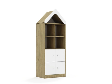 Mebel 2-kolumnowy posiadający 6 półek i daszek. Front wykonany z płyty melaminowanej o grubości 18 mm. Dostępne kolory: biały, szary, dąb kamienny. Zastosowane zawiasy Häfele Metalla 110 SM wpuszczane z hamulcem (cichy domyk) oraz prowadniki z systemem Clip Top, dzięki którym montaż i demontaż frontów odbywa się bez konieczności używania narzędzi. Plastikowy uchwyt w kolorze białym, osadzony w płycie meblowej. Jego płaska konstrukcja zapewnia większe bezpieczeństwo użytkowania. Daszek stanowi atrakcyjny dodatek do linii mebli BLOX. Korona daszka wykonana z solidnej płyty MDF o grubości 16 mm, malowana i lakierowana farbą posiadającą atest Polskiego Towarzystwa Alergologicznego (PTA). Przód i boki daszku w kolorze białym, tył w kolorze korpusu. Cała powierzchnia daszka posiada zaokrąglone krawędzie, uzyskane dzięki precyzyjnemu wycinaniu na ploterze frezującym, co zwiększa bezpieczeństwo użytkowania. Element przymocowany do korpusu mebla za pomocą elementów pośredniczących.