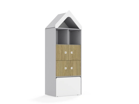 Regał Blox Base 70 4PP 4F1 ze skrzynią i daszkiem 706x466x1927 korpus szary/4x front dąb