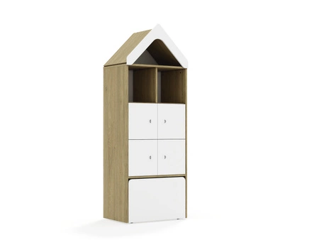 Mebel 2-kolumnowy posiadający 6 półek i daszek. Front wykonany z płyty melaminowanej o grubości 18 mm. Dostępne kolory: biały, szary, dąb kamienny. Zastosowane zawiasy Häfele Metalla 110 SM wpuszczane z hamulcem (cichy domyk) oraz prowadniki z systemem Clip Top, dzięki którym montaż i demontaż frontów odbywa się bez konieczności używania narzędzi. Plastikowy uchwyt w kolorze białym, osadzony w płycie meblowej. Jego płaska konstrukcja zapewnia większe bezpieczeństwo użytkowania. Skrzynia wsuwana w mebel wykonana z płyty melaminowanej o grubości 18 mm, wyposażona w kółka, które nie rysują podłogi. Front wykonany z płyty melaminowanej o grubości 18 mm w kolorze białym. Konstrukcja skrzyni umożliwia łatwe wysuwanie, co zapewnia wygodny dostęp do przechowywanych przedmiotów. Dzięki solidnym materiałom i mobilności, skrzynia stanowi praktyczne rozwiązanie do zwiększenia funkcjonalności mebla, oferując dodatkową przestrzeń do przechowywania oraz ochronę podłogi przed uszkodzeniami. Daszek stanowi atrakcyjny dodatek do linii mebli BLOX. Korona daszka wykonana z solidnej płyty MDF o grubości 16 mm, malowana i lakierowana farbą posiadającą atest Polskiego Towarzystwa Alergologicznego (PTA). Przód i boki daszku w kolorze białym, tył w kolorze korpusu. Cała powierzchnia daszka posiada zaokrąglone krawędzie, uzyskane dzięki precyzyjnemu wycinaniu na ploterze frezującym, co zwiększa bezpieczeństwo użytkowania. Element przymocowany do korpusu mebla za pomocą elementów pośredniczących.