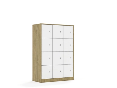 Mebel 3-kolumnowy posiadający 9 półek. Front wykonany z płyty melaminowanej o grubości 18 mm. Dostępne kolory: biały, szary, dąb kamienny. Zastosowane zawiasy Häfele Metalla 110 SM wpuszczane z hamulcem (cichy domyk) oraz prowadniki z systemem Clip Top, dzięki którym montaż i demontaż frontów odbywa się bez konieczności używania narzędzi. Plastikowy uchwyt w kolorze białym, osadzony w płycie meblowej. Jego płaska konstrukcja zapewnia większe bezpieczeństwo użytkowania.