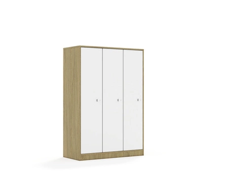 Mebel 3-kolumnowy posiadający 9 półek. Front wykonany z płyty melaminowanej o grubości 18 mm. Dostępne kolory: biały, szary, dąb kamienny. Zastosowane zawiasy Häfele Metalla 110 SM wpuszczane z hamulcem (cichy domyk) oraz prowadniki z systemem Clip Top, dzięki którym montaż i demontaż frontów odbywa się bez konieczności używania narzędzi. Plastikowy uchwyt w kolorze białym, osadzony w płycie meblowej. Jego płaska konstrukcja zapewnia większe bezpieczeństwo użytkowania. Mebel wyposażony w zamek, który zapewnia dodatkową ochronę i bezpieczeństwo przechowywanych przedmiotów.