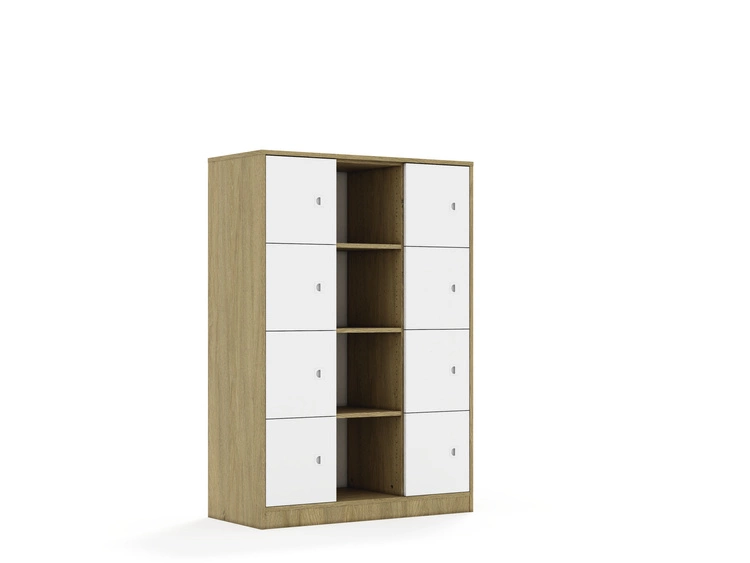 Mebel 3-kolumnowy posiadający 9 półek. Front wykonany z płyty melaminowanej o grubości 18 mm. Dostępne kolory: biały, szary, dąb kamienny. Zastosowane zawiasy Häfele Metalla 110 SM wpuszczane z hamulcem (cichy domyk) oraz prowadniki z systemem Clip Top, dzięki którym montaż i demontaż frontów odbywa się bez konieczności używania narzędzi. Plastikowy uchwyt w kolorze białym, osadzony w płycie meblowej. Jego płaska konstrukcja zapewnia większe bezpieczeństwo użytkowania.