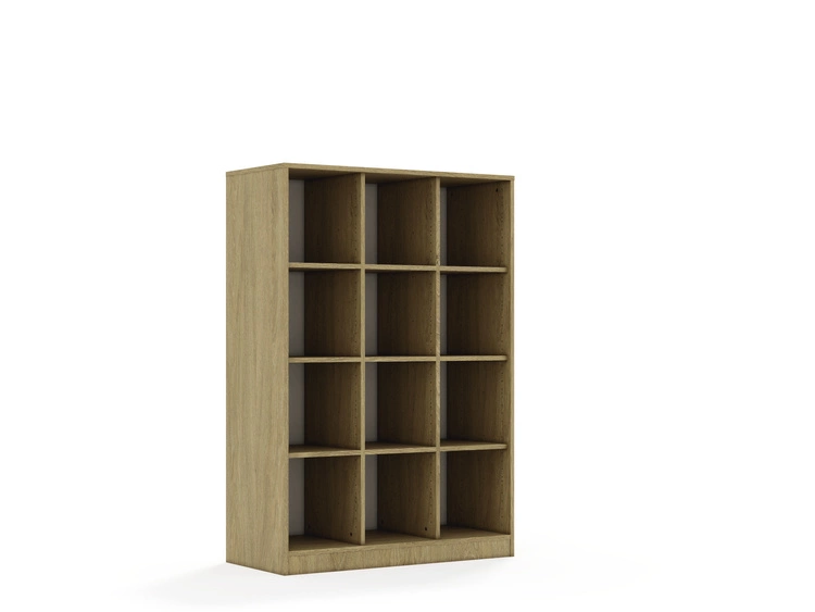 Korpus posiadający uniwersalne owiercenia umożliwiające zamontowanie półek na różnych wysokościach. Cokół w kolorze korpusu chroniący dolne krawędzie mebla przed uszkodzeniami i zabrudzeniami. Półki w kolorze korpusu wykonane z płyty melaminowanej o grubości 18 mm. Mocowanie półek za pomocą złącz RAFIX firmy Hafele. Montaż polegajacy na wsunięciu półki z góry w dół, podobnie jak przy tradycyjnych podpórkach. Wbudowany mechanizm mimośrodu dociągający półkę, zapewniający wysoką stabilność mebla. Stopki regulujące umożliwiające wypoziomowanie mebla. Stopki antypoślizgowe zabezpieczające podłogę przed zarysowaniem. Ściany tylne mebla wykonane z białej płyty HDF o grubości 3mm. Wpuszczane w nutę wykonaną w bokach oraz wieńcu górnym co nadaje stabilności meblom oraz sprawia, że wszelkie połączenia płyty hdf z meblem są niewidoczne. Dodatkowo HDF usztywniony jest punktowymi, również niewidocznymi plastikowymi stabilizatorami wkręconymi i wciśniętymi między płytę a nutę. Przegroda w kolorze korpusu wykonana z płyty melaminowanej o grubości 18 mm.