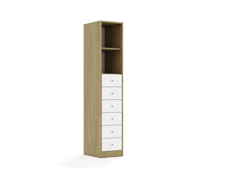 Mebel 1-kolumnowy posiadający 4 półki. Szuflada wykonana z płyty melaninowanej o grubości 18 mm o klasie higeniczności E1. Dostępne kolory: biały, szary, dąb kamienny. Metalowe prowadnice z wysokogatunkowej stali, wyposażone w funkcję samodociągu, zapewniają trwałość, wytrzymałość oraz płynne i ciche zamykanie. Mechanizm automatycznie domyka szufladę po lekkim popchnięciu, gwarantując wygodę i bezszelestne użytkowanie. Plastikowy uchwyt w kolorze białym, osadzony w płycie meblowej. Jego płaska konstrukcja zapewnia większe bezpieczeństwo użytkowania.