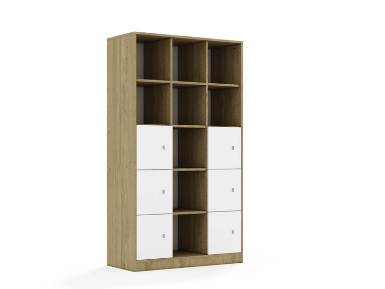 Mebel 3-kolumnowy posiadający 12 półek. Front wykonany z płyty melaminowanej o grubości 18 mm. Dostępne kolory: biały, szary, dąb kamienny. Zastosowane zawiasy Häfele Metalla 110 SM wpuszczane z hamulcem (cichy domyk) oraz prowadniki z systemem Clip Top, dzięki którym montaż i demontaż frontów odbywa się bez konieczności używania narzędzi. Plastikowy uchwyt w kolorze białym, osadzony w płycie meblowej. Jego płaska konstrukcja zapewnia większe bezpieczeństwo użytkowania.