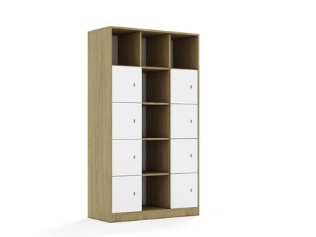 Mebel 3-kolumnowy posiadający 12 półek. Front wykonany z płyty melaminowanej o grubości 18 mm. Dostępne kolory: biały, szary, dąb kamienny. Zastosowane zawiasy Häfele Metalla 110 SM wpuszczane z hamulcem (cichy domyk) oraz prowadniki z systemem Clip Top, dzięki którym montaż i demontaż frontów odbywa się bez konieczności używania narzędzi. Plastikowy uchwyt w kolorze białym, osadzony w płycie meblowej. Jego płaska konstrukcja zapewnia większe bezpieczeństwo użytkowania.