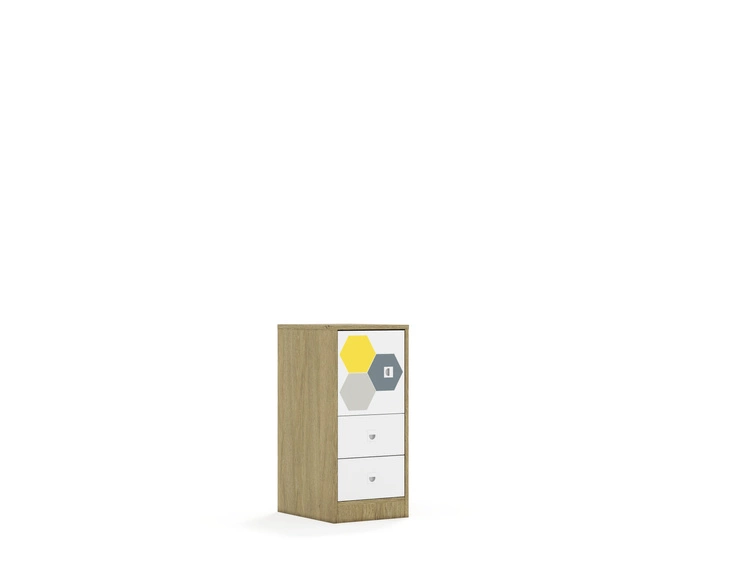 Kolekcja mebli szkolnych Hex to funkcjonalne i estetyczne rozwiązanie, idealne do każdej przestrzeni edukacyjnej. Fronty szafek i szuflad są w kolorze białym, ozdobione drukowanymi motywami połączonych sześciokątów, które dodają meblom nowoczesnego i dynamicznego wyglądu. Nadruki są dostępne w kolorach zielonych, czerwonych, niebiesko-fioletowych oraz szaro-żółtych, co pozwala na tworzenie interesujących i kolorowych aranżacji w przestrzeni szkolnej. Korpus posiadający uniwersalne owiercenia umożliwiające zamontowanie półek na różnych wysokościach. Cokół w kolorze korpusu chroniący dolne krawędzie mebla przed uszkodzeniami i zabrudzeniami. Półki w kolorze korpusu wykonane z płyty melaminowanej o grubości 18 mm. Mocowanie półek za pomocą złącz RAFIX firmy Hafele. Montaż polegajacy na wsunięciu półki z góry w dół, podobnie jak przy tradycyjnych podpórkach. Wbudowany mechanizm mimośrodu dociągający półkę, zapewniający wysoką stabilność mebla. Stopki regulujące umożliwiające wypoziomowanie mebla. Stopki antypoślizgowe zabezpieczające podłogę przed zarysowaniem. Ściany tylne mebla wykonane z białej płyty HDF o grubości 3mm. Wpuszczane w nutę wykonaną w bokach oraz wieńcu górnym co nadaje stabilności meblom oraz sprawia, że wszelkie połączenia płyty hdf z meblem są niewidoczne. Dodatkowo HDF usztywniony jest punktowymi, również niewidocznymi plastikowymi stabilizatorami wkręconymi i wciśniętymi między płytę a nutę.