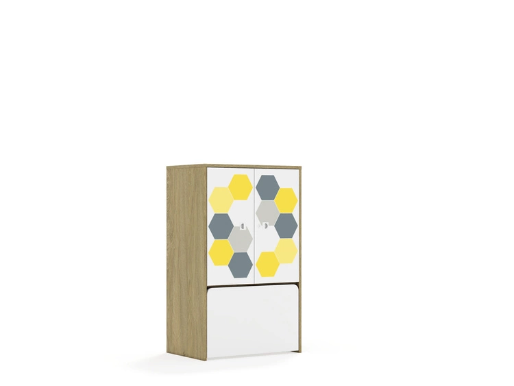 Kolekcja mebli szkolnych Hex to funkcjonalne i estetyczne rozwiązanie, idealne do każdej przestrzeni edukacyjnej. Fronty szafek i szuflad są w kolorze białym, ozdobione drukowanymi motywami połączonych sześciokątów, które dodają meblom nowoczesnego i dynamicznego wyglądu. Nadruki są dostępne w kolorach zielonych, czerwonych, niebiesko-fioletowych oraz szaro-żółtych, co pozwala na tworzenie interesujących i kolorowych aranżacji w przestrzeni szkolnej. Korpus posiadający uniwersalne owiercenia umożliwiające zamontowanie półek na różnych wysokościach. Cokół w kolorze korpusu chroniący dolne krawędzie mebla przed uszkodzeniami i zabrudzeniami. Półki w kolorze korpusu wykonane z płyty melaminowanej o grubości 18 mm. Mocowanie półek za pomocą złącz RAFIX firmy Hafele. Montaż polegajacy na wsunięciu półki z góry w dół, podobnie jak przy tradycyjnych podpórkach. Wbudowany mechanizm mimośrodu dociągający półkę, zapewniający wysoką stabilność mebla. Stopki regulujące umożliwiające wypoziomowanie mebla. Stopki antypoślizgowe zabezpieczające podłogę przed zarysowaniem. Ściany tylne mebla wykonane z białej płyty HDF o grubości 3mm. Wpuszczane w nutę wykonaną w bokach oraz wieńcu górnym co nadaje stabilności meblom oraz sprawia, że wszelkie połączenia płyty hdf z meblem są niewidoczne. Dodatkowo HDF usztywniony jest punktowymi, również niewidocznymi plastikowymi stabilizatorami wkręconymi i wciśniętymi między płytę a nutę.