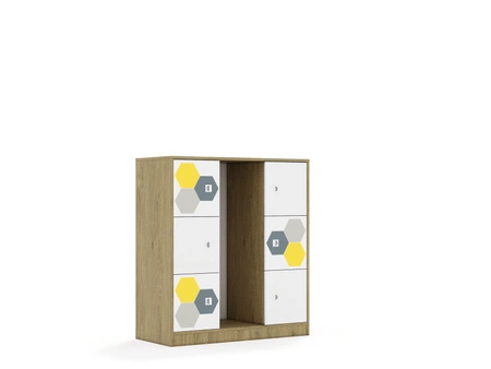 Kolekcja mebli szkolnych Hex to funkcjonalne i estetyczne rozwiązanie, idealne do każdej przestrzeni edukacyjnej. Fronty szafek i szuflad są w kolorze białym, ozdobione drukowanymi motywami połączonych sześciokątów, które dodają meblom nowoczesnego i dynamicznego wyglądu. Nadruki są dostępne w kolorach zielonych, czerwonych, niebiesko-fioletowych oraz szaro-żółtych, co pozwala na tworzenie interesujących i kolorowych aranżacji w przestrzeni szkolnej. Korpus posiadający uniwersalne owiercenia umożliwiające zamontowanie półek na różnych wysokościach. Cokół w kolorze korpusu chroniący dolne krawędzie mebla przed uszkodzeniami i zabrudzeniami. Półki w kolorze korpusu wykonane z płyty melaminowanej o grubości 18 mm. Mocowanie półek za pomocą złącz RAFIX firmy Hafele. Montaż polegajacy na wsunięciu półki z góry w dół, podobnie jak przy tradycyjnych podpórkach. Wbudowany mechanizm mimośrodu dociągający półkę, zapewniający wysoką stabilność mebla. Stopki regulujące umożliwiające wypoziomowanie mebla. Stopki antypoślizgowe zabezpieczające podłogę przed zarysowaniem. Ściany tylne mebla wykonane z białej płyty HDF o grubości 3mm. Wpuszczane w nutę wykonaną w bokach oraz wieńcu górnym co nadaje stabilności meblom oraz sprawia, że wszelkie połączenia płyty hdf z meblem są niewidoczne. Dodatkowo HDF usztywniony jest punktowymi, również niewidocznymi plastikowymi stabilizatorami wkręconymi i wciśniętymi między płytę a nutę. Przegroda w kolorze korpusu wykonana z płyty melaminowanej o grubości 18 mm.