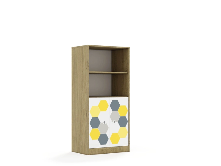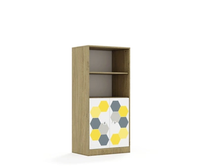 Kolekcja mebli szkolnych Hex to funkcjonalne i estetyczne rozwiązanie, idealne do każdej przestrzeni edukacyjnej. Fronty szafek i szuflad są w kolorze białym, ozdobione drukowanymi motywami połączonych sześciokątów, które dodają meblom nowoczesnego i dynamicznego wyglądu. Nadruki są dostępne w kolorach zielonych, czerwonych, niebiesko-fioletowych oraz szaro-żółtych, co pozwala na tworzenie interesujących i kolorowych aranżacji w przestrzeni szkolnej. Korpus posiadający uniwersalne owiercenia umożliwiające zamontowanie półek na różnych wysokościach. Cokół w kolorze korpusu chroniący dolne krawędzie mebla przed uszkodzeniami i zabrudzeniami. Półki w kolorze korpusu wykonane z płyty melaminowanej o grubości 18 mm. Mocowanie półek za pomocą złącz RAFIX firmy Hafele. Montaż polegajacy na wsunięciu półki z góry w dół, podobnie jak przy tradycyjnych podpórkach. Wbudowany mechanizm mimośrodu dociągający półkę, zapewniający wysoką stabilność mebla. Stopki regulujące umożliwiające wypoziomowanie mebla. Stopki antypoślizgowe zabezpieczające podłogę przed zarysowaniem. Ściany tylne mebla wykonane z białej płyty HDF o grubości 3mm. Wpuszczane w nutę wykonaną w bokach oraz wieńcu górnym co nadaje stabilności meblom oraz sprawia, że wszelkie połączenia płyty hdf z meblem są niewidoczne. Dodatkowo HDF usztywniony jest punktowymi, również niewidocznymi plastikowymi stabilizatorami wkręconymi i wciśniętymi między płytę a nutę.