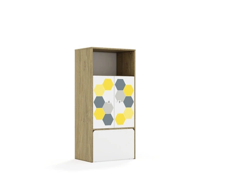 Kolekcja mebli szkolnych Hex to funkcjonalne i estetyczne rozwiązanie, idealne do każdej przestrzeni edukacyjnej. Fronty szafek i szuflad są w kolorze białym, ozdobione drukowanymi motywami połączonych sześciokątów, które dodają meblom nowoczesnego i dynamicznego wyglądu. Nadruki są dostępne w kolorach zielonych, czerwonych, niebiesko-fioletowych oraz szaro-żółtych, co pozwala na tworzenie interesujących i kolorowych aranżacji w przestrzeni szkolnej. Korpus posiadający uniwersalne owiercenia umożliwiające zamontowanie półek na różnych wysokościach. Cokół w kolorze korpusu chroniący dolne krawędzie mebla przed uszkodzeniami i zabrudzeniami. Półki w kolorze korpusu wykonane z płyty melaminowanej o grubości 18 mm. Mocowanie półek za pomocą złącz RAFIX firmy Hafele. Montaż polegajacy na wsunięciu półki z góry w dół, podobnie jak przy tradycyjnych podpórkach. Wbudowany mechanizm mimośrodu dociągający półkę, zapewniający wysoką stabilność mebla. Stopki regulujące umożliwiające wypoziomowanie mebla. Stopki antypoślizgowe zabezpieczające podłogę przed zarysowaniem. Ściany tylne mebla wykonane z białej płyty HDF o grubości 3mm. Wpuszczane w nutę wykonaną w bokach oraz wieńcu górnym co nadaje stabilności meblom oraz sprawia, że wszelkie połączenia płyty hdf z meblem są niewidoczne. Dodatkowo HDF usztywniony jest punktowymi, również niewidocznymi plastikowymi stabilizatorami wkręconymi i wciśniętymi między płytę a nutę.