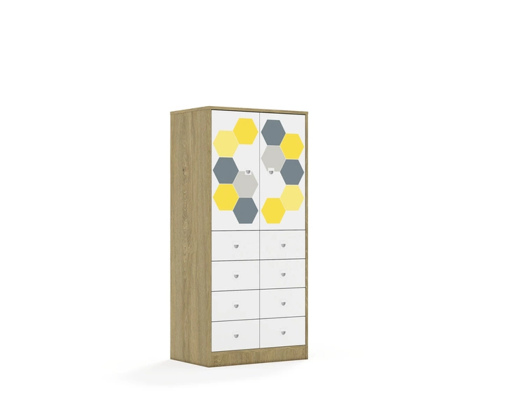 Kolekcja mebli szkolnych Hex to funkcjonalne i estetyczne rozwiązanie, idealne do każdej przestrzeni edukacyjnej. Fronty szafek i szuflad są w kolorze białym, ozdobione drukowanymi motywami połączonych sześciokątów, które dodają meblom nowoczesnego i dynamicznego wyglądu. Nadruki są dostępne w kolorach zielonych, czerwonych, niebiesko-fioletowych oraz szaro-żółtych, co pozwala na tworzenie interesujących i kolorowych aranżacji w przestrzeni szkolnej. Korpus posiadający uniwersalne owiercenia umożliwiające zamontowanie półek na różnych wysokościach. Cokół w kolorze korpusu chroniący dolne krawędzie mebla przed uszkodzeniami i zabrudzeniami. Półki w kolorze korpusu wykonane z płyty melaminowanej o grubości 18 mm. Mocowanie półek za pomocą złącz RAFIX firmy Hafele. Montaż polegajacy na wsunięciu półki z góry w dół, podobnie jak przy tradycyjnych podpórkach. Wbudowany mechanizm mimośrodu dociągający półkę, zapewniający wysoką stabilność mebla. Stopki regulujące umożliwiające wypoziomowanie mebla. Stopki antypoślizgowe zabezpieczające podłogę przed zarysowaniem. Ściany tylne mebla wykonane z białej płyty HDF o grubości 3mm. Wpuszczane w nutę wykonaną w bokach oraz wieńcu górnym co nadaje stabilności meblom oraz sprawia, że wszelkie połączenia płyty hdf z meblem są niewidoczne. Dodatkowo HDF usztywniony jest punktowymi, również niewidocznymi plastikowymi stabilizatorami wkręconymi i wciśniętymi między płytę a nutę. Przegroda w kolorze korpusu wykonana z płyty melaminowanej o grubości 18 mm.