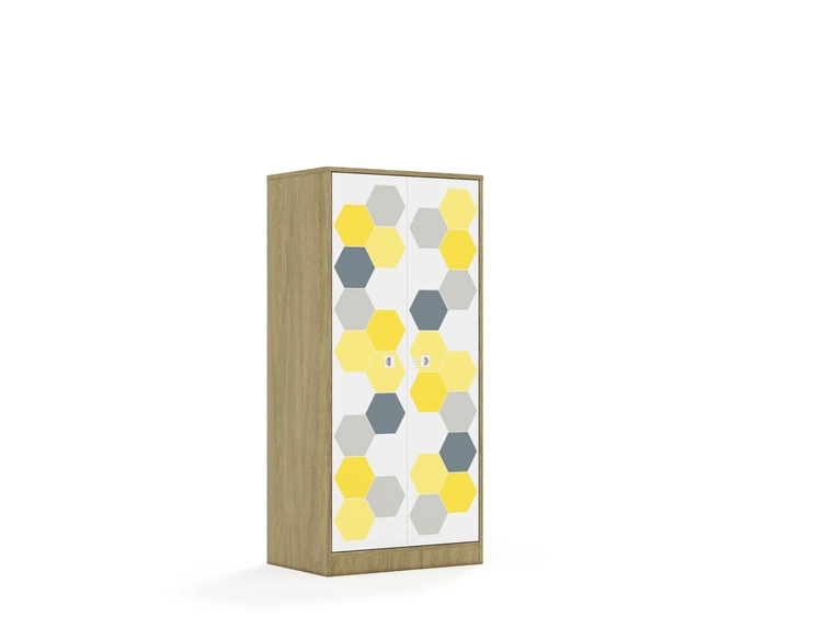 Kolekcja mebli szkolnych Hex to funkcjonalne i estetyczne rozwiązanie, idealne do każdej przestrzeni edukacyjnej. Fronty szafek i szuflad są w kolorze białym, ozdobione drukowanymi motywami połączonych sześciokątów, które dodają meblom nowoczesnego i dynamicznego wyglądu. Nadruki są dostępne w kolorach zielonych, czerwonych, niebiesko-fioletowych oraz szaro-żółtych, co pozwala na tworzenie interesujących i kolorowych aranżacji w przestrzeni szkolnej. Korpus posiadający uniwersalne owiercenia umożliwiające zamontowanie półek na różnych wysokościach. Cokół w kolorze korpusu chroniący dolne krawędzie mebla przed uszkodzeniami i zabrudzeniami. Półki w kolorze korpusu wykonane z płyty melaminowanej o grubości 18 mm. Mocowanie półek za pomocą złącz RAFIX firmy Hafele. Montaż polegajacy na wsunięciu półki z góry w dół, podobnie jak przy tradycyjnych podpórkach. Wbudowany mechanizm mimośrodu dociągający półkę, zapewniający wysoką stabilność mebla. Stopki regulujące umożliwiające wypoziomowanie mebla. Stopki antypoślizgowe zabezpieczające podłogę przed zarysowaniem. Ściany tylne mebla wykonane z białej płyty HDF o grubości 3mm. Wpuszczane w nutę wykonaną w bokach oraz wieńcu górnym co nadaje stabilności meblom oraz sprawia, że wszelkie połączenia płyty hdf z meblem są niewidoczne. Dodatkowo HDF usztywniony jest punktowymi, również niewidocznymi plastikowymi stabilizatorami wkręconymi i wciśniętymi między płytę a nutę. Przegroda w kolorze korpusu wykonana z płyty melaminowanej o grubości 18 mm.