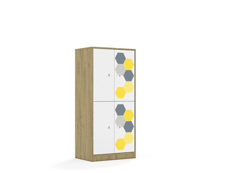 Kolekcja mebli szkolnych Hex to funkcjonalne i estetyczne rozwiązanie, idealne do każdej przestrzeni edukacyjnej. Fronty szafek i szuflad są w kolorze białym, ozdobione drukowanymi motywami połączonych sześciokątów, które dodają meblom nowoczesnego i dynamicznego wyglądu. Nadruki są dostępne w kolorach zielonych, czerwonych, niebiesko-fioletowych oraz szaro-żółtych, co pozwala na tworzenie interesujących i kolorowych aranżacji w przestrzeni szkolnej. Korpus posiadający uniwersalne owiercenia umożliwiające zamontowanie półek na różnych wysokościach. Cokół w kolorze korpusu chroniący dolne krawędzie mebla przed uszkodzeniami i zabrudzeniami. Półki w kolorze korpusu wykonane z płyty melaminowanej o grubości 18 mm. Mocowanie półek za pomocą złącz RAFIX firmy Hafele. Montaż polegajacy na wsunięciu półki z góry w dół, podobnie jak przy tradycyjnych podpórkach. Wbudowany mechanizm mimośrodu dociągający półkę, zapewniający wysoką stabilność mebla. Stopki regulujące umożliwiające wypoziomowanie mebla. Stopki antypoślizgowe zabezpieczające podłogę przed zarysowaniem. Ściany tylne mebla wykonane z białej płyty HDF o grubości 3mm. Wpuszczane w nutę wykonaną w bokach oraz wieńcu górnym co nadaje stabilności meblom oraz sprawia, że wszelkie połączenia płyty hdf z meblem są niewidoczne. Dodatkowo HDF usztywniony jest punktowymi, również niewidocznymi plastikowymi stabilizatorami wkręconymi i wciśniętymi między płytę a nutę. Przegroda w kolorze korpusu wykonana z płyty melaminowanej o grubości 18 mm.