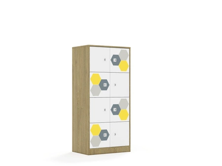 Kolekcja mebli szkolnych Hex to funkcjonalne i estetyczne rozwiązanie, idealne do każdej przestrzeni edukacyjnej. Fronty szafek i szuflad są w kolorze białym, ozdobione drukowanymi motywami połączonych sześciokątów, które dodają meblom nowoczesnego i dynamicznego wyglądu. Nadruki są dostępne w kolorach zielonych, czerwonych, niebiesko-fioletowych oraz szaro-żółtych, co pozwala na tworzenie interesujących i kolorowych aranżacji w przestrzeni szkolnej. Korpus posiadający uniwersalne owiercenia umożliwiające zamontowanie półek na różnych wysokościach. Cokół w kolorze korpusu chroniący dolne krawędzie mebla przed uszkodzeniami i zabrudzeniami. Półki w kolorze korpusu wykonane z płyty melaminowanej o grubości 18 mm. Mocowanie półek za pomocą złącz RAFIX firmy Hafele. Montaż polegajacy na wsunięciu półki z góry w dół, podobnie jak przy tradycyjnych podpórkach. Wbudowany mechanizm mimośrodu dociągający półkę, zapewniający wysoką stabilność mebla. Stopki regulujące umożliwiające wypoziomowanie mebla. Stopki antypoślizgowe zabezpieczające podłogę przed zarysowaniem. Ściany tylne mebla wykonane z białej płyty HDF o grubości 3mm. Wpuszczane w nutę wykonaną w bokach oraz wieńcu górnym co nadaje stabilności meblom oraz sprawia, że wszelkie połączenia płyty hdf z meblem są niewidoczne. Dodatkowo HDF usztywniony jest punktowymi, również niewidocznymi plastikowymi stabilizatorami wkręconymi i wciśniętymi między płytę a nutę. Przegroda w kolorze korpusu wykonana z płyty melaminowanej o grubości 18 mm.