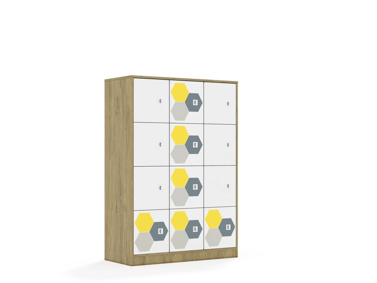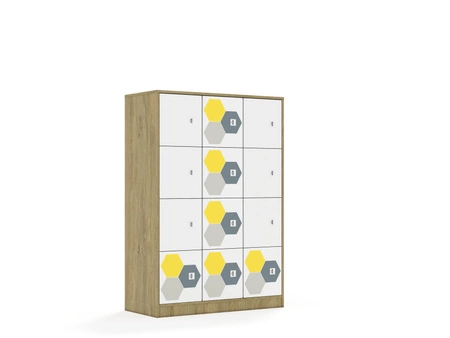 Kolekcja mebli szkolnych Hex to funkcjonalne i estetyczne rozwiązanie, idealne do każdej przestrzeni edukacyjnej. Fronty szafek i szuflad są w kolorze białym, ozdobione drukowanymi motywami połączonych sześciokątów, które dodają meblom nowoczesnego i dynamicznego wyglądu. Nadruki są dostępne w kolorach zielonych, czerwonych, niebiesko-fioletowych oraz szaro-żółtych, co pozwala na tworzenie interesujących i kolorowych aranżacji w przestrzeni szkolnej. Korpus posiadający uniwersalne owiercenia umożliwiające zamontowanie półek na różnych wysokościach. Cokół w kolorze korpusu chroniący dolne krawędzie mebla przed uszkodzeniami i zabrudzeniami. Półki w kolorze korpusu wykonane z płyty melaminowanej o grubości 18 mm. Mocowanie półek za pomocą złącz RAFIX firmy Hafele. Montaż polegajacy na wsunięciu półki z góry w dół, podobnie jak przy tradycyjnych podpórkach. Wbudowany mechanizm mimośrodu dociągający półkę, zapewniający wysoką stabilność mebla. Stopki regulujące umożliwiające wypoziomowanie mebla. Stopki antypoślizgowe zabezpieczające podłogę przed zarysowaniem. Ściany tylne mebla wykonane z białej płyty HDF o grubości 3mm. Wpuszczane w nutę wykonaną w bokach oraz wieńcu górnym co nadaje stabilności meblom oraz sprawia, że wszelkie połączenia płyty hdf z meblem są niewidoczne. Dodatkowo HDF usztywniony jest punktowymi, również niewidocznymi plastikowymi stabilizatorami wkręconymi i wciśniętymi między płytę a nutę. Przegroda w kolorze korpusu wykonana z płyty melaminowanej o grubości 18 mm.
