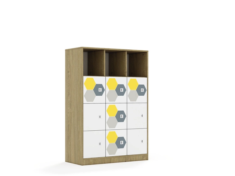 Kolekcja mebli szkolnych Hex to funkcjonalne i estetyczne rozwiązanie, idealne do każdej przestrzeni edukacyjnej. Fronty szafek i szuflad są w kolorze białym, ozdobione drukowanymi motywami połączonych sześciokątów, które dodają meblom nowoczesnego i dynamicznego wyglądu. Nadruki są dostępne w kolorach zielonych, czerwonych, niebiesko-fioletowych oraz szaro-żółtych, co pozwala na tworzenie interesujących i kolorowych aranżacji w przestrzeni szkolnej. Korpus posiadający uniwersalne owiercenia umożliwiające zamontowanie półek na różnych wysokościach. Cokół w kolorze korpusu chroniący dolne krawędzie mebla przed uszkodzeniami i zabrudzeniami. Półki w kolorze korpusu wykonane z płyty melaminowanej o grubości 18 mm. Mocowanie półek za pomocą złącz RAFIX firmy Hafele. Montaż polegajacy na wsunięciu półki z góry w dół, podobnie jak przy tradycyjnych podpórkach. Wbudowany mechanizm mimośrodu dociągający półkę, zapewniający wysoką stabilność mebla. Stopki regulujące umożliwiające wypoziomowanie mebla. Stopki antypoślizgowe zabezpieczające podłogę przed zarysowaniem. Ściany tylne mebla wykonane z białej płyty HDF o grubości 3mm. Wpuszczane w nutę wykonaną w bokach oraz wieńcu górnym co nadaje stabilności meblom oraz sprawia, że wszelkie połączenia płyty hdf z meblem są niewidoczne. Dodatkowo HDF usztywniony jest punktowymi, również niewidocznymi plastikowymi stabilizatorami wkręconymi i wciśniętymi między płytę a nutę. Przegroda w kolorze korpusu wykonana z płyty melaminowanej o grubości 18 mm.