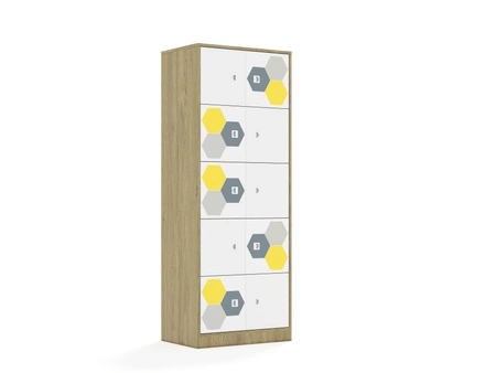 Kolekcja mebli szkolnych Hex to funkcjonalne i estetyczne rozwiązanie, idealne do każdej przestrzeni edukacyjnej. Fronty szafek i szuflad są w kolorze białym, ozdobione drukowanymi motywami połączonych sześciokątów, które dodają meblom nowoczesnego i dynamicznego wyglądu. Nadruki są dostępne w kolorach zielonych, czerwonych, niebiesko-fioletowych oraz szaro-żółtych, co pozwala na tworzenie interesujących i kolorowych aranżacji w przestrzeni szkolnej. Korpus posiadający uniwersalne owiercenia umożliwiające zamontowanie półek na różnych wysokościach. Cokół w kolorze korpusu chroniący dolne krawędzie mebla przed uszkodzeniami i zabrudzeniami. Półki w kolorze korpusu wykonane z płyty melaminowanej o grubości 18 mm. Mocowanie półek za pomocą złącz RAFIX firmy Hafele. Montaż polegajacy na wsunięciu półki z góry w dół, podobnie jak przy tradycyjnych podpórkach. Wbudowany mechanizm mimośrodu dociągający półkę, zapewniający wysoką stabilność mebla. Stopki regulujące umożliwiające wypoziomowanie mebla. Stopki antypoślizgowe zabezpieczające podłogę przed zarysowaniem. Ściany tylne mebla wykonane z białej płyty HDF o grubości 3mm. Wpuszczane w nutę wykonaną w bokach oraz wieńcu górnym co nadaje stabilności meblom oraz sprawia, że wszelkie połączenia płyty hdf z meblem są niewidoczne. Dodatkowo HDF usztywniony jest punktowymi, również niewidocznymi plastikowymi stabilizatorami wkręconymi i wciśniętymi między płytę a nutę. Przegroda w kolorze korpusu wykonana z płyty melaminowanej o grubości 18 mm.